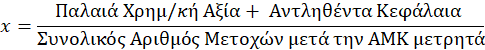 Προς διευκόλυνση, παρατίθεται ο τύπος υπολογισμού της προσαρμοσμένης τιμής εκκίνησης της μετοχής, που εφαρμόζεται βάσει της Απόφασης 26 του ΔΣ του Χ.Α. για κάθε αύξηση μετοχικού κεφαλαίου (ΑΜΚ) με καταβολή μετρητών υπέρ των παλαιών μετόχων της εταιρίας: