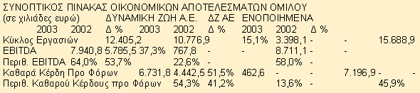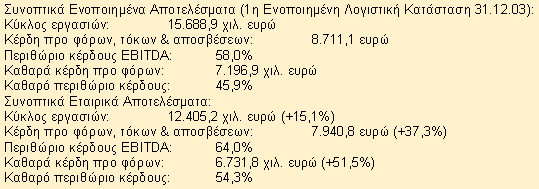 Σε μητρικό επίπεδο η Εταιρία αύξησε τα κέρδη προ φόρων κατά 51,5%, τα οποία διαμορφώθηκαν σε 6.731,8 χιλ. ευρώ. Σημειώνεται ότι τα κέρδη προ φόρων διαμορφώθηκαν τελικά υψηλότερα κατά ποσοστό 3.5% από την αρχική πρόβλεψη της Εταιρίας όπως αποτυπώνεται στο επενδυτικό της σχέδιο. Το περιθώριο καθαρού κέρδους κατά το 2003 διαμορφώθηκε σε 54,3%, παρουσιάζοντας σημαντική αύξηση σε σύγκριση με την προηγούμενη χρήση. Σημειώνεται ότι τα καθαρά κέρδη προ φόρων επηρεάζονται από τις σημαντικές επενδύσεις της Εταιρίας για την ανάπτυξη στο εξωτερικό. Οι σχετικές επενδύσεις σε ακινητοποιήσεις για τη χρήση 2003 διαμορφώθηκαν σε 876 χιλ. ευρώ, ενώ τα αποτελέσματα επιβαρύνθηκαν με αποσβέσεις της τάξεως των 175 χιλ. ευρώ, ποσό το οποίο βεβαίως αυξάνεται σημαντικά εάν προστεθούν τα λειτουργικά έξοδα αλλά και οι προκαταβολές σε προμηθευτές που σχετίζονται με την ανάπτυξη στο εξωτερικό.