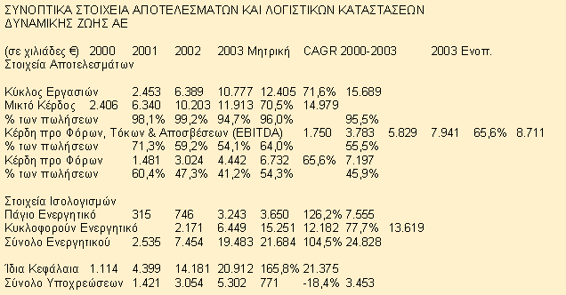 Ο ενοποιημένος κύκλος εργασιών της ΔΥΝΑΜΙΚΗ ΖΩΗ Α.Ε. διαμορφώθηκε στο τέλος του 2003 σε 15.688,9 χιλ. ευρώ.