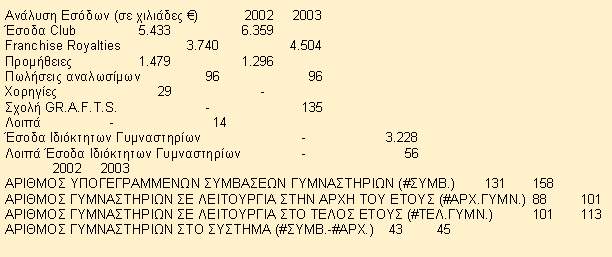 Σημειώνεται ότι τα συνεργαζόμενα γυμναστήρια αυξήθηκαν το 2003 σε 158 (από τα οποία τα 113 βρίσκονται ήδη σε λειτουργία) από 131 κατά το τέλος του 2002. Επιπλέον, οι νέες συνδρομές Club στα γυμναστήρια του δικτύου διαμορφώθηκαν το 2003 σε 43.070 από 32.196 το 2002, παρουσιάζοντας αύξηση της τάξεως του 33,8%. Τα κέρδη προ φόρων, τόκων και αποσβέσεων (EBITDA) σε ενοποιημένο επίπεδο διαμορφώθηκαν σε 8.711,1 χιλ. ευρώ ενώ το περιθώριο EBITDA διαμορφώθηκε σε 58,0%.