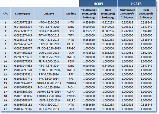 Το Χρηματιστήριο Αθηνών ανακοινώνει τις αλλαγές στη σύνθεση των Δεικτών Ελληνικών Εταιρικών Ομολόγων καθώς και τους νέους συντελεστές στάθμισης των ομολόγων που συμμετέχουν στη σύνθεση των Δεικτών στο πλαίσιο των Βασικών Κανόνων.