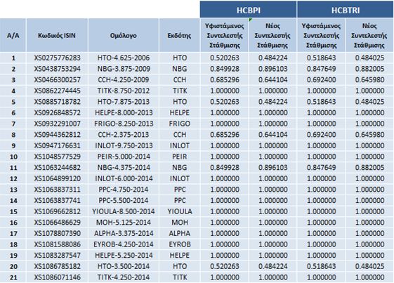 Το Χρηματιστήριο Αθηνών ανακοινώνει τις αλλαγές στη σύνθεση των Δεικτών Ελληνικών Εταιρικών Ομολόγων καθώς και τους νέους συντελεστές στάθμισης των ομολόγων που συμμετέχουν στη σύνθεση των Δεικτών στο πλαίσιο των Βασικών Κανόνων.