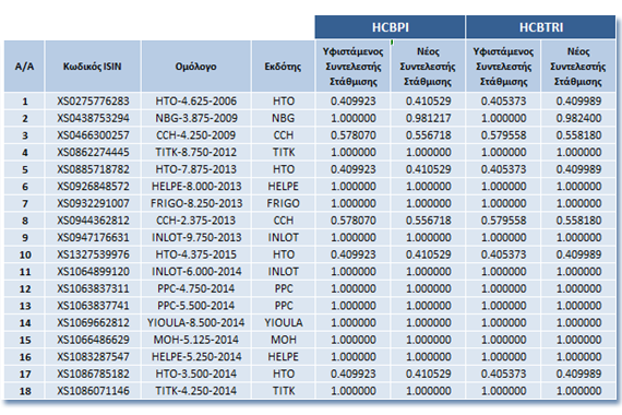 Το Χρηματιστήριο Αθηνών ανακοινώνει τις αλλαγές στη σύνθεση των Δεικτών Ελληνικών Εταιρικών Ομολόγων καθώς και τους νέους συντελεστές στάθμισης των ομολόγων που συμμετέχουν στη σύνθεση των Δεικτών στο πλαίσιο των Βασικών Κανόνων.