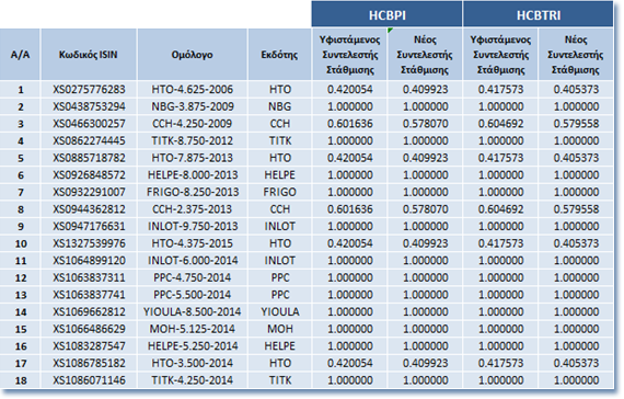 Το Χρηματιστήριο Αθηνών ανακοινώνει τις αλλαγές στη σύνθεση των Δεικτών Ελληνικών Εταιρικών Ομολόγων καθώς και τους νέους συντελεστές στάθμισης των ομολόγων που συμμετέχουν στη σύνθεση των Δεικτών στο πλαίσιο των Βασικών Κανόνων.