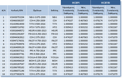 Το Χρηματιστήριο Αθηνών ανακοινώνει τους νέους συντελεστές στάθμισης των ομολόγων που συμμετέχουν στη σύνθεση των Δεικτών Ελληνικών Εταιρικών Ομολόγων στο πλαίσιο των Βασικών Κανόνων.