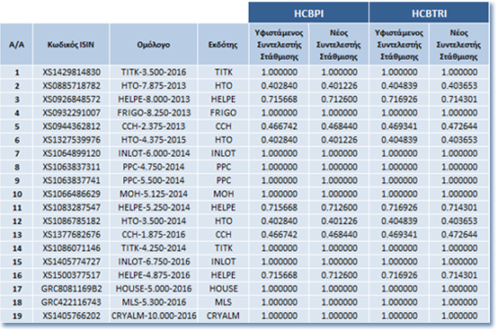 Το Χρηματιστήριο Αθηνών ανακοινώνει τους νέους συντελεστές στάθμισης των ομολόγων που συμμετέχουν στη σύνθεση των Δεικτών σύμφωνα με τους Βασικούς Κανόνες.
