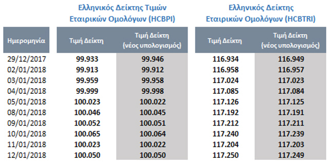 Σε συνέχεια του προβλήματος στον υπολογισμό της τιμής κλεισίματος συγκεκριμένων εταιρικών ομολόγων για τη συνεδρίαση της 29ης Δεκεμβρίου 2017 πραγματοποιήθηκε εκ νέου υπολογισμός των τιμών κλεισίματος των Δεικτών Ελληνικών Εταιρικών Ομολόγων.