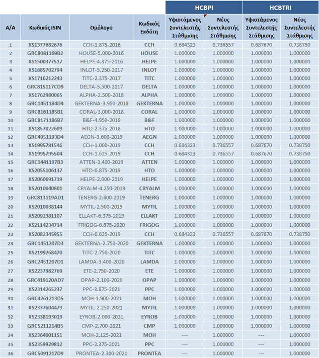 Το Χρηματιστήριο Αθηνών ανακοινώνει αλλαγές στη σύνθεση των δεικτών «Ελληνικών Εταιρικών Ομολόγων» σύμφωνα με τους Βασικούς Κανόνες.