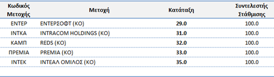 Οι συντελεστές στάθμισης (Capping Factors) των μετοχών που συμμετέχουν στη σύνθεση του δείκτη θα υπολογιστούν με βάση το κλείσιμο της συνεδρίασης της Τετάρτης 15 Δεκεμβρίου 2021.