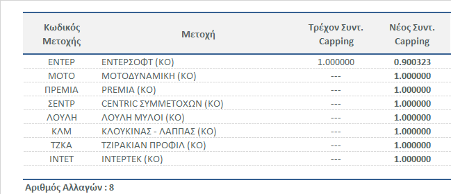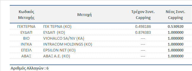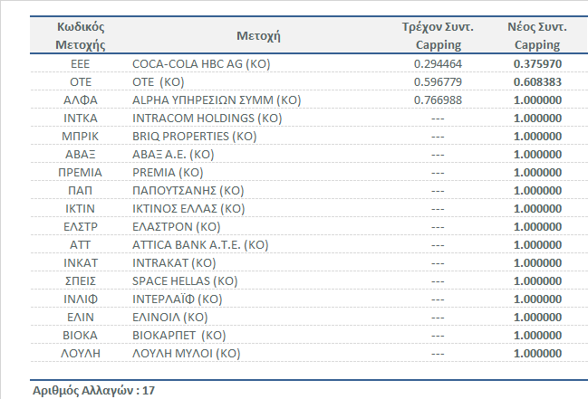 Το Χρηματιστήριο Αθηνών, σε συνέχεια της τακτικής εξαμηνιαίας αναθεώρησης των δεικτών της Αγοράς Μετοχών Χ.Α. για τη περίοδο Μάϊος 2021 - Οκτώβριος 2021, ανακοινώνει τους νέους Συντελεστές Στάθμισης (Capping Factors) των μετοχών που συμμετέχουν στη σύνθεση των δεικτών:
