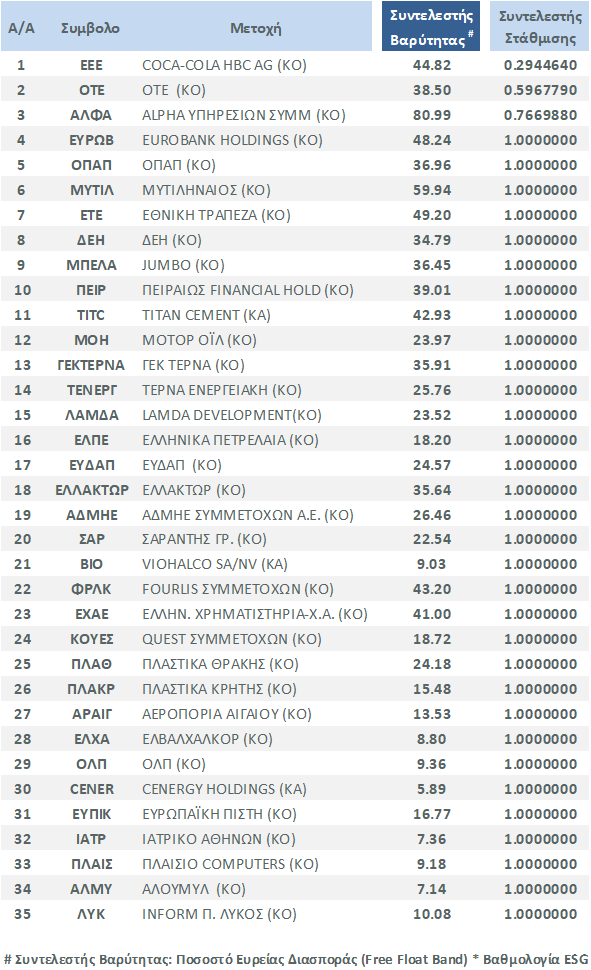 Σύνθεση και Συντελεστές Στάθμισης Μετοχών του Δείκτη ATHEX ESG