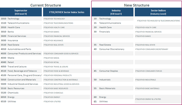 Δημιουργία νέων κλαδικών δεικτών, σε αντικατάσταση των υφιστάμενων. Το περιβάλλον επιλογής των νέων κλαδικών δεικτών μεταφέρεται από το Επίπεδο ΙΙ ("Supersector") στο Επίπεδο Ι ("Industry") του μοντέλου κλαδικής κατάταξης των εταιρειών (ICB) με τη συγχώνευση σε έναν δείκτη, αντίστοιχα, των: