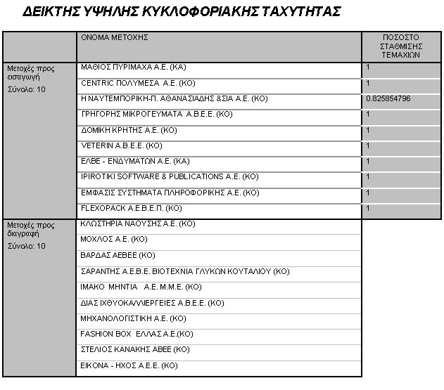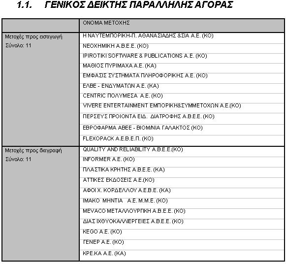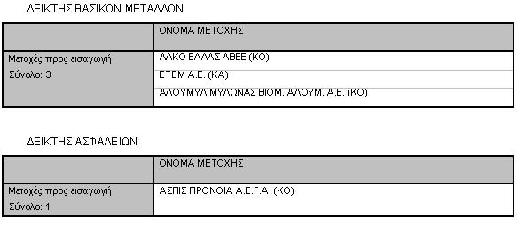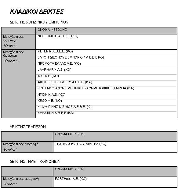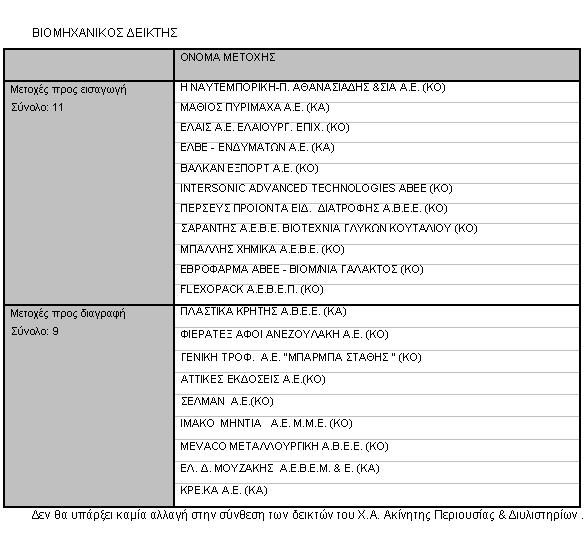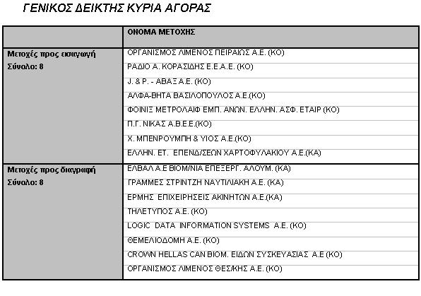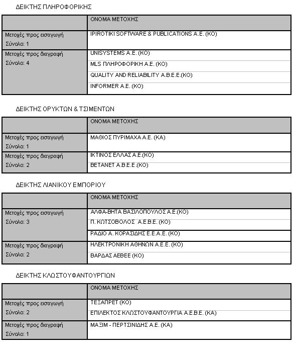 Η Επιτροπή Δεικτών στην σημερινή της συνεδρίαση ενέκρινε τις ακόλουθες αλλαγές στην σύνθεση των δεικτών του Χρηματιστηρίου Αθηνών όπως αυτές προκύπτουν κατ'' εφαρμογή των "Βασικών κανόνων διαχείρισης και λειτουργίας των Δεικτών". Υπενθυμίζεται ότι για τους Γενικούς Δείκτες η κατάταξη προκύπτει από τον αριθμητικό μέσο της σειράς διαβάθμισης κάθε μετοχής της ιστορικής αξίας συναλλαγών άνευ πακέτων του εξαμήνου 1/10 - 31/3 και της μέσης χρηματιστηριακής αξίας την ίδια περίοδο. Οι αλλαγές θα ισχύουν αμέσως μετά το κλείσιμο των εργασιών της συνεδρίασης της 7ης Μαΐου 2004, δηλαδή την 10 Μαΐου 2004.