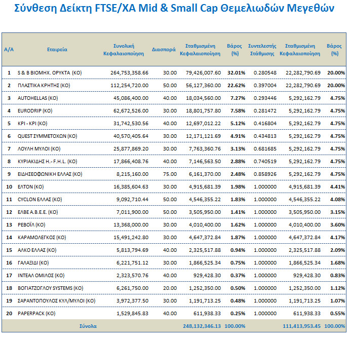 Ο δείκτης θα λαμβάνει υπόψη του το ποσοστό ευρείας διασποράς (Free Float) των μετοχών ενώ θα υπάρχει συντελεστής στάθμισης των μετοχών με βάρος μεγαλύτερο από το 20% της αξίας του δείκτη (capping).