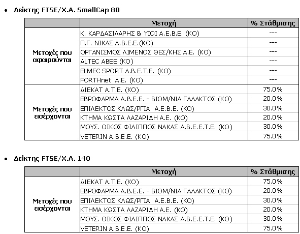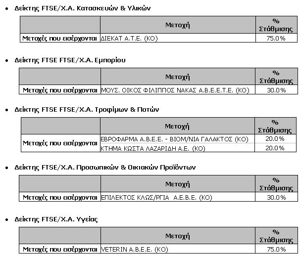 Επίσης, αλλαγή του ποσοστού στάθμισης λόγω μεταβολής των ποσοστών ευρείας διασποράς των μετοχών των εταιρειών ΜΠΑΜΠΗΣ ΒΩΒΟΣ ΔΙΕΘΝΗΣ ΤΕΧΝΙΚΗ Α.Ε. (από 50.0% σε 75.0%) και ΕΓΝΑΤΙΑ ΤΡΑΠΕΖΑ Α.Ε. (από 100.0% σε 75.0%) σε όλους τους Δείκτες FTSE/Χ.Α. στους οποίους συμμετέχουν.