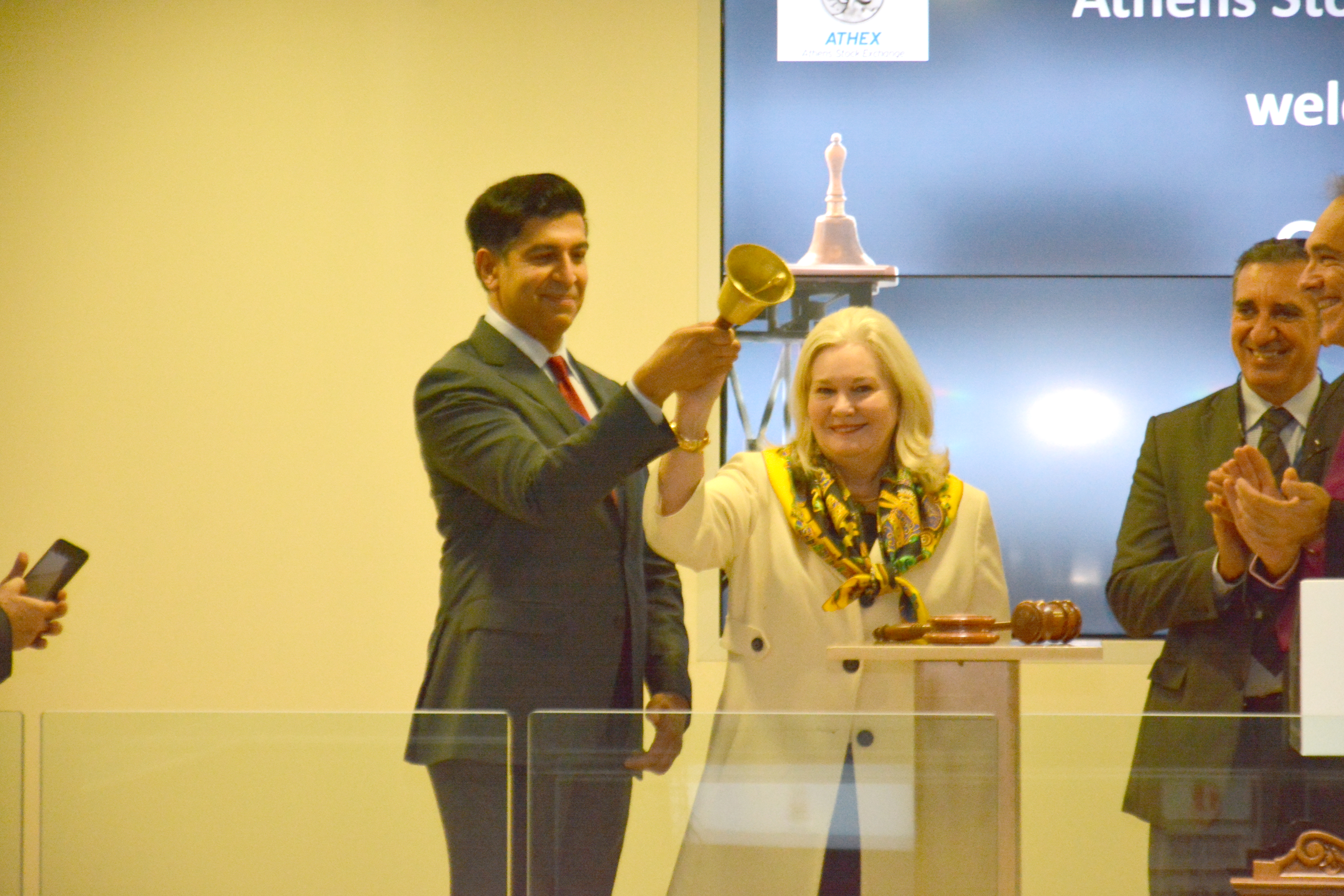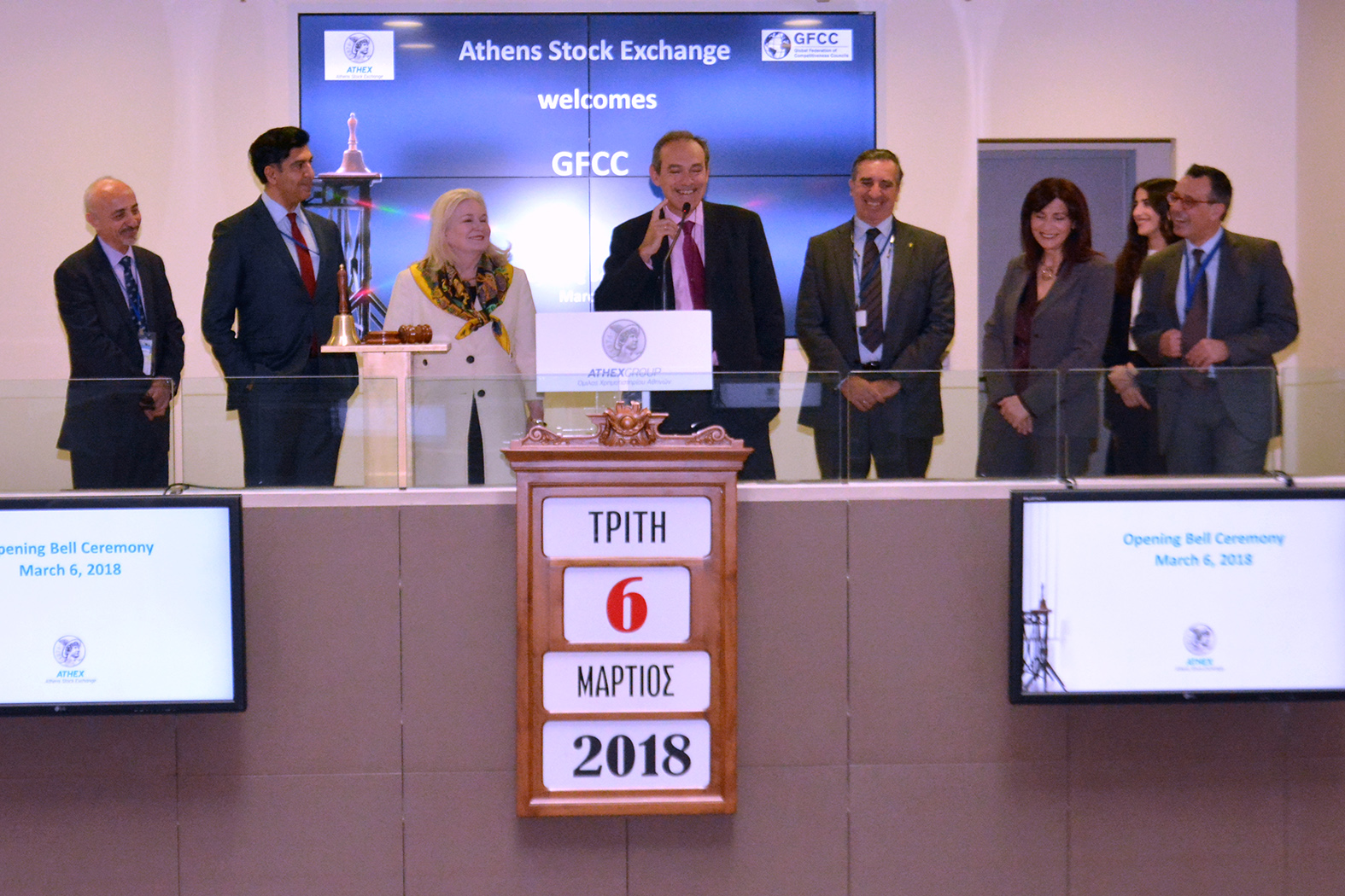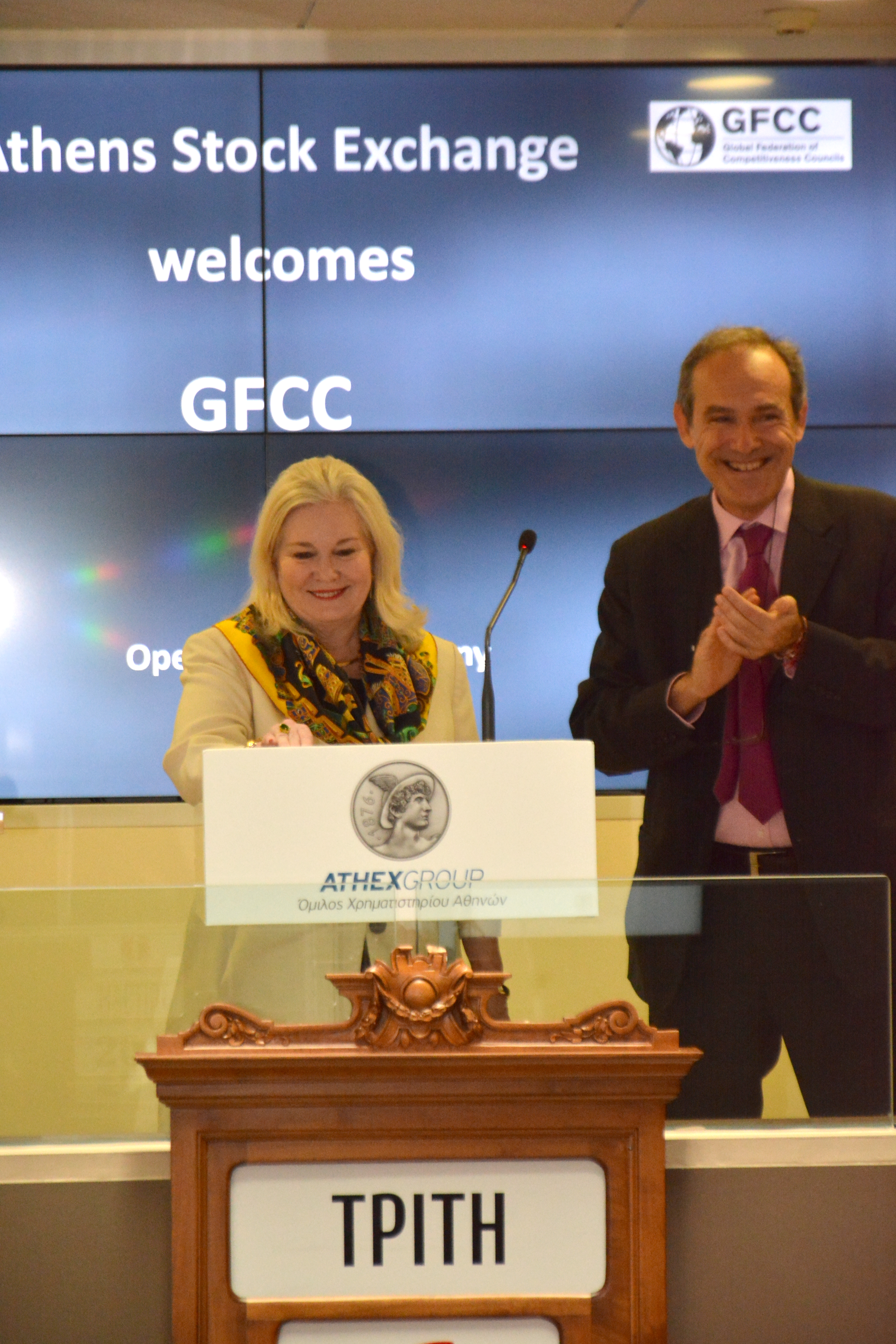 Today, March 6th, it was Ms. Deborah Wince-Smith, President and CEO of the Global Federation of Competitiveness Councils (GFCC) and of the United States Council on Competitiveness who rang the traditional bell during the ceremony for the opening of the trading session of the Athens Stock Exchange, in the framework of her visit to Greece for the Federation's participation in the Delphi Economic Forum.