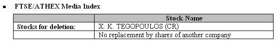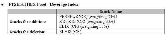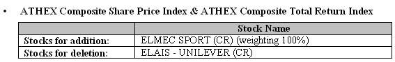 Following the Decision of the ATHEX BoD on April 4, 2007, referring to changes in the composition of the Category Trading Status the following changes will be realized in the composition of the ATHEX Indices. More specifically: