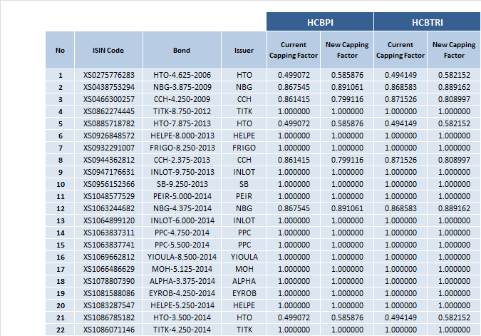 Athens Stock Exchange announces the changes in the composition of Hellenic Corporate Bond Indices and in the capping factors of the bonds participation in the composition of the indices according to Index Ground Rules.