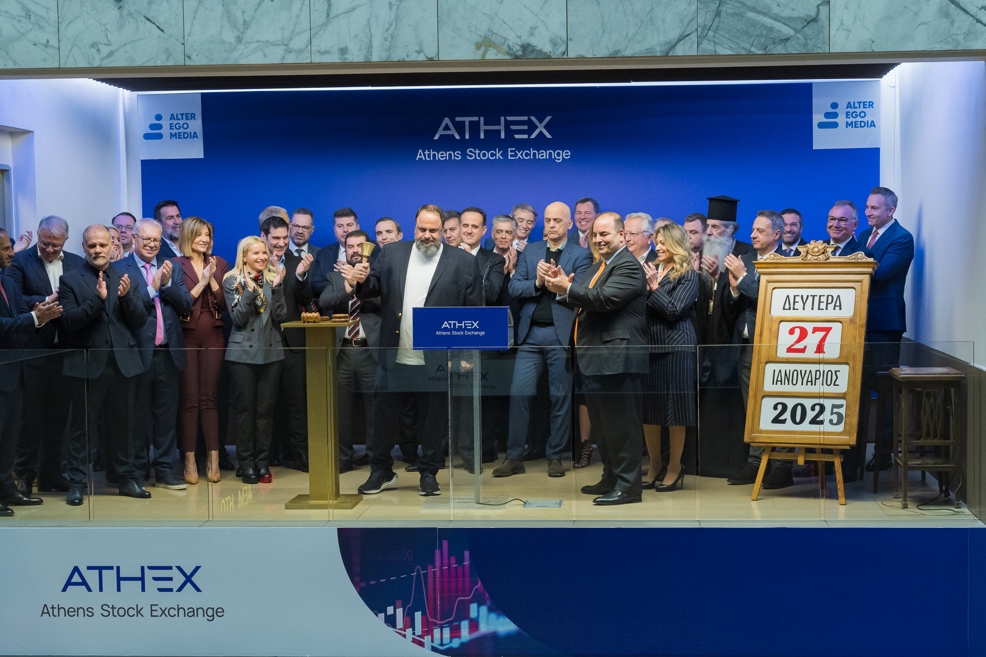 The CEO of the Athens Exchange Group, Mr. Yianos Kontopoulos, welcomed the representatives of Alter Ego Media, marking the first company listing of 2025. "The new year finds the Athens Stock Exchange continuing on a trajectory of growth and stability, despite the multiple challenges and uncertainties shaping the European and global environment. The positive momentum of the Greek economy is also strongly reflected in the sustained interest and confidence demonstrated by the international investment community in the Greek stock market. Over the past year, the presence of foreign investors in our market capitalization further increased, reaching 58%. Within this very positive and promising environment, we welcome the management, executives, and partners of Alter Ego Media today and congratulate them on the remarkable success of their public offering."