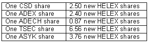 More specifically, the shareholders of the companies mentioned above will be invited, through an announcement in the press, to contribute their shares to cover HELEX's share capital increase. These shareholders will receive HELEX shares, which will be floated in the Main Market of the Athens Stock Exchange.