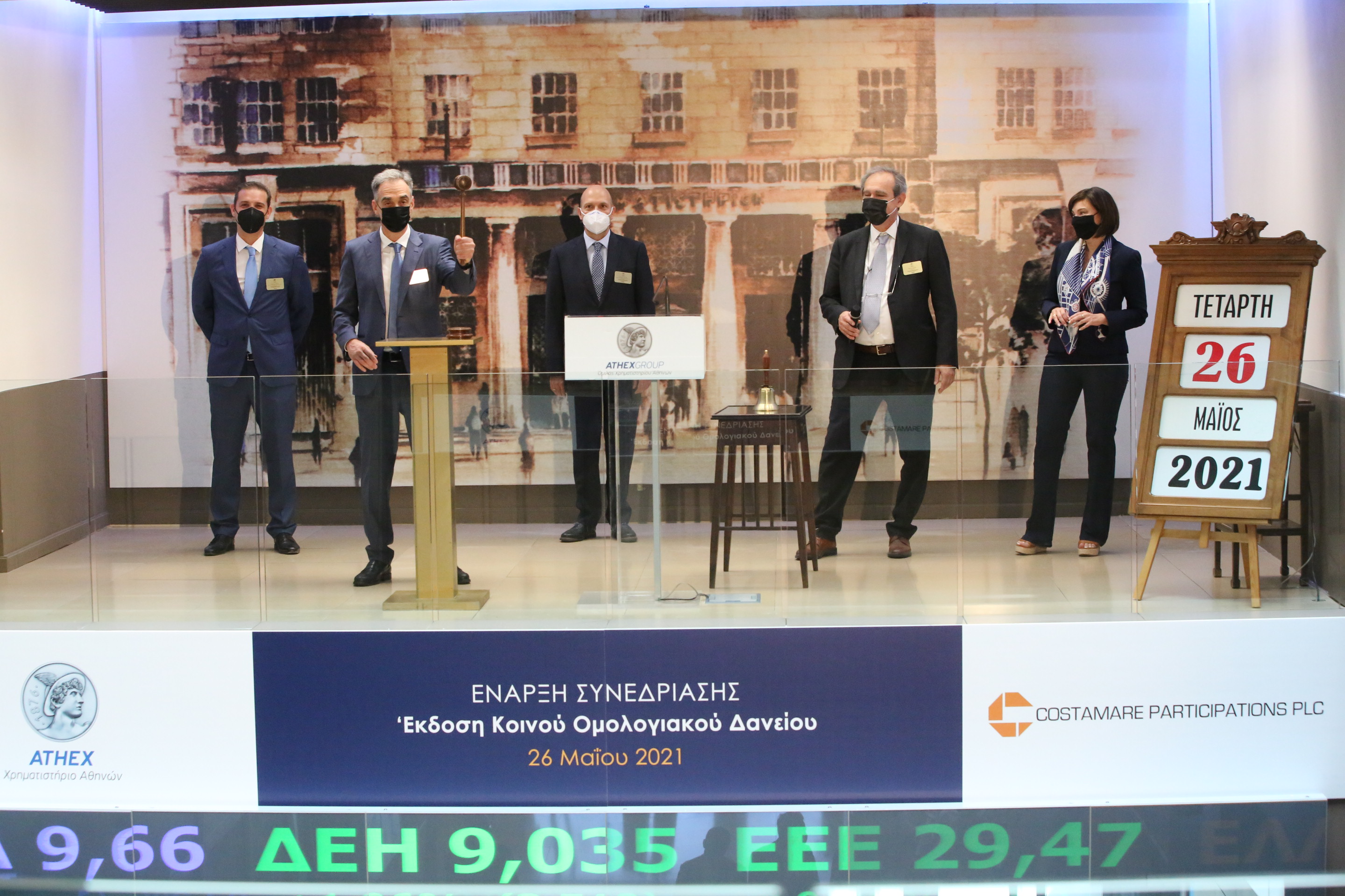 To Χρηματιστήριο Αθηνών υποδέχθηκε σήμερα την εταιρεία Costamare Participations Plc με αφορμή την εισαγωγή προς διαπραγμάτευση στην Οργανωμένη Αγορά του Χρηματιστηρίου Αθηνών του εταιρικού της ομολόγου. Συνολικά αντλήθηκαν 100.000.000 ευρώ. Το Εκτελεστικό Μέλος του ΔΣ της εταιρείας, Γρηγόρης Ζήκος, χτύπησε το παραδοσιακό καμπανάκι κηρύσσοντας την έναρξη της συνεδρίασης. Το παρών έδωσαν και οι κ.κ. Αναστάσιος Γαβριηλίδης, Εκτελεστικό Μέλος ΔΣ και Δημήτρης Παγκράτης, Finance Director.