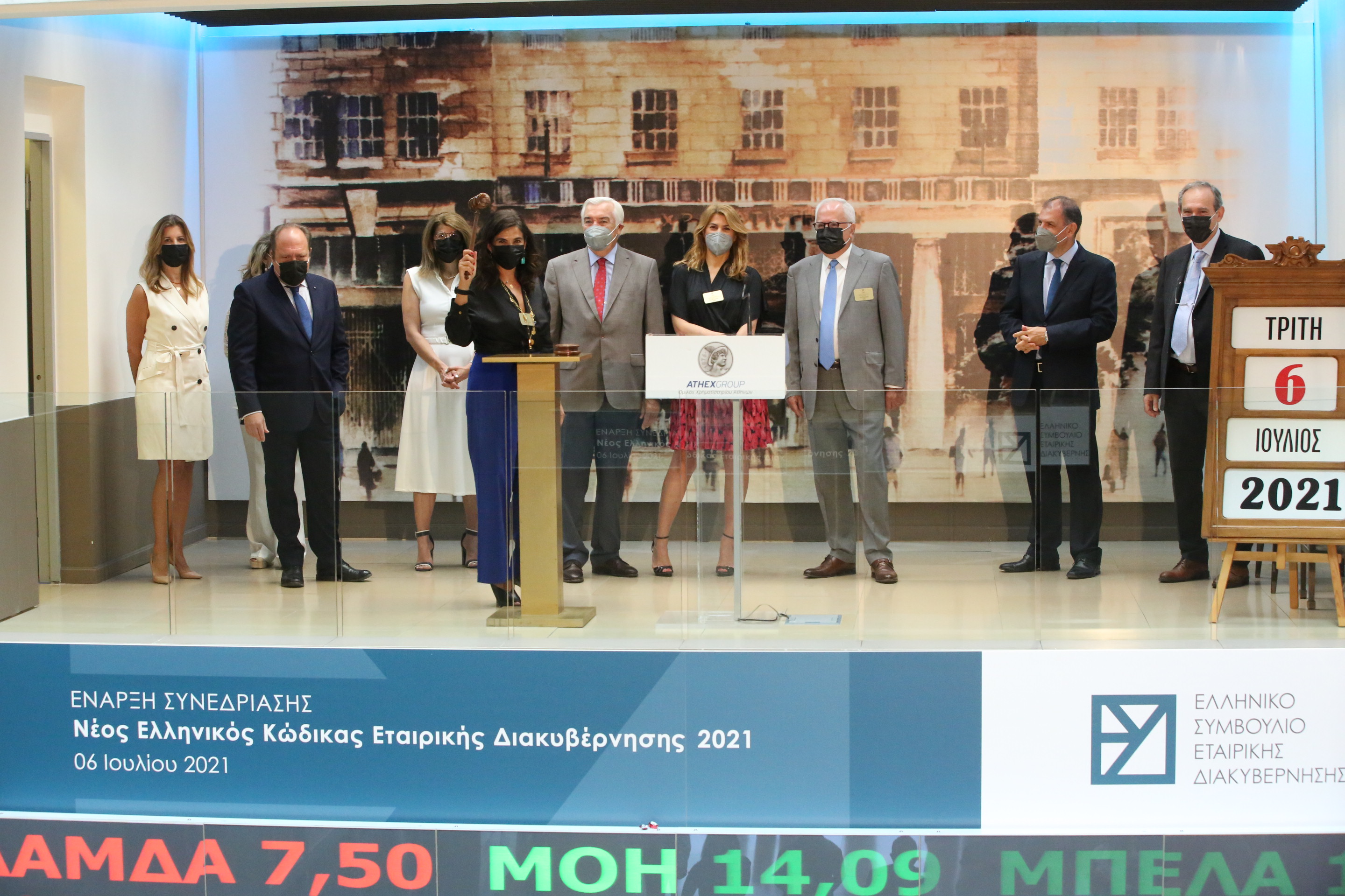 Με αφορμή την έκδοση του Αναθεωρημένου Ελληνικού Κώδικα Εταιρικής Διακυβέρνησης 2021 από το ΕΣΕΔ, Ο Διευθύνων Σύμβουλος του Ομίλου Χρηματιστηρίου Αθηνών Σωκράτης Λαζαρίδης υποδέχτηκε τα Μέλη του Συμβουλίου Διοίκησης και του 15μελούς Συμβουλίου Εταιρικής Διακυβέρνησης του ΕΣΕΔ. Η Αντιπρόεδρος του ΕΣΕΔ κα. Ξένια Καζόλη εν απουσία του κου. George Serafeim, Προέδρου του ΕΣΕΔ , χτύπησε το παραδοσιακό καμπανάκι έναρξης της συνεδρίασης της 6ης Ιουλίου 2021.