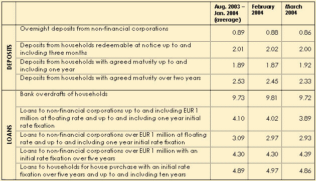 MFI interest rates on outstanding amounts: The weighted average interest rate paid on outstanding amounts of deposits from households with an agreed maturity up to and including two years declined by 2 basis points to 1.92% in March 2004. The weighted average interest rate paid on outstanding amounts of deposits from non-financial corporations with an agreed maturity up to and including two years remained broadly unchanged at 2.07% in March.