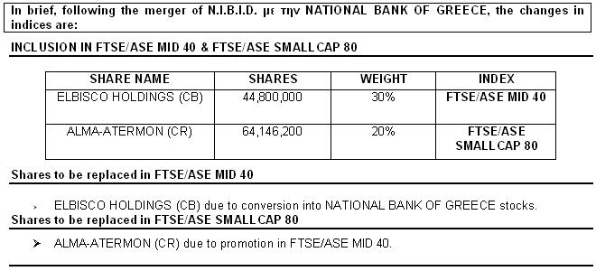 Due to the merger of N.I.B.I.D. with NATIONAL BANK OF GREECE and consequently the trading stop of the shares of N.I.B.I.D. as of 23/12/2002, the following changes will take place: the shares of N.I.B.I.D. in FTSE/ASE MID 40 will be replaced by ELBISCO HOLDINGS. This share was the first share in rank according to the Ground Rules. As a result of vacancy in FTSE/ASE SMALLCAP 80, the first share in rank according to the Ground Rules is ALMA-ATERMON S.A. (CR).