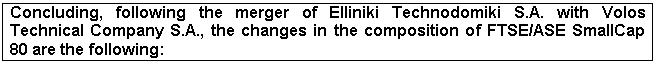 Due to the merger of Elliniki Technodomiki S.A. with Volos Technical Company S.A. and consequently the cessation of trading of the shares of Volos Technical Company S.A., as of July 29, 2002 the following changes will take place: the share of Volos Technical Co S.A. in FTSE/ASE SmallCap 80 will be replaced by the share of OPAP S.A. This share was the first share in rank according to the Ground Rules on July 25, 2002, which was conducted according to section 7.2.2. of the Ground Rules for the Calculation & Management of FTSE/ASE 20, FTSE/ASE Mid 40 & FTSE/ASE SmallCap 80.