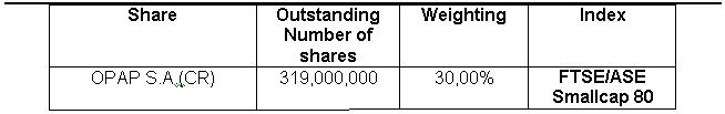 The share of OPAP S.A. will participate in FTSE/ASE SmallCap 80 as of July 2002 with weight 30%.