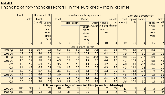 - In the third quarter of 2003, the annual growth rate of financing of the non-financial sectors in the euro area rose to 5.0%, up from 4.7% in the previous quarter (see Table 1). The annual growth rate of debt financing also increased, to 5.8% in the third quarter of 2003 up from 5.6% in the second quarter of 2003, and the annual growth rate of quoted shares issued by non-financial corporations rose to 1.0%, up from 0.8%.