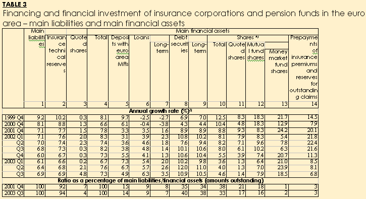 - The annual growth rate of financing of insurance corporations and pension funds in the euro area increased to 6.9% in the third quarter of 2003 up from 6.4% in the previous quarter (see Table 3).