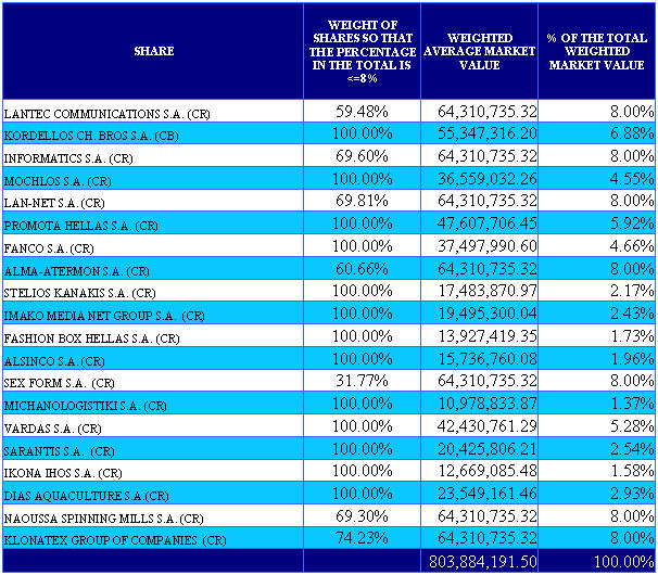 In the following table, the shares? weighting percentage, which constitutes the Index, is presented so that each share?s participation percentage of the period, on total average market value does not exceed 8.00%.