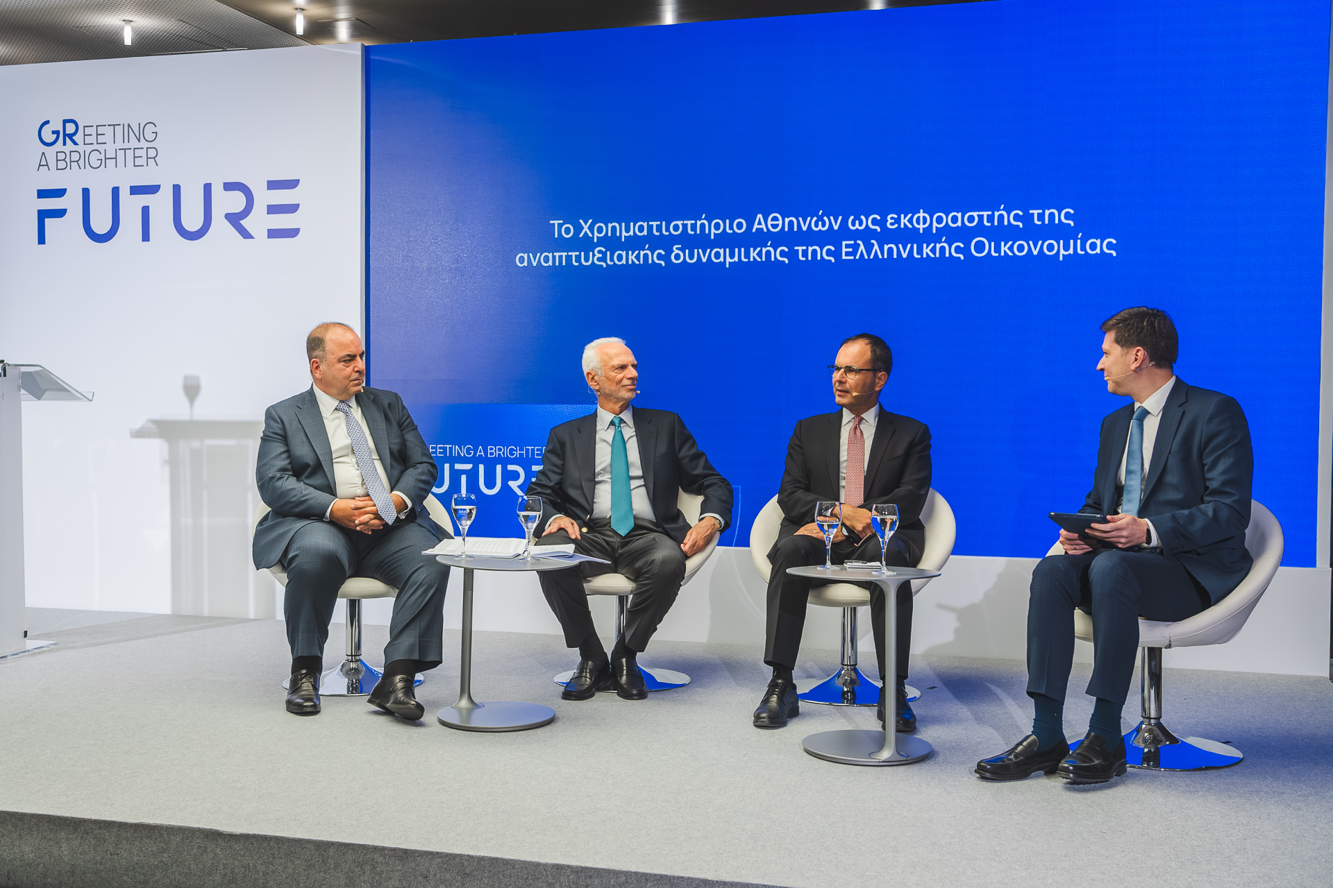 The official presentation of the new corporate image and identity was followed by a panel discussion titled: “The Athens Stock Exchange and Its Role in the Growth of the Greek Economy” The discussion, moderated by journalist Mr. Apostolos Maggiriadis, featured the participation of Mr. Alexis Patelis, Head of the Prime Minister’s Economic Office, Mr. Petros Tzanetakis, Deputy CEO of Motor Oil, and Mr. Yianos Kontopoulos.