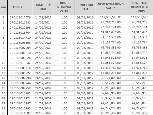 - Listing of additional number of bonds of the Hellenic Republic to the below listed Greek Government Bonds, following the completion of the Exchange Offer with bonds of the 20 Greek Government Bonds issued during the PSI: