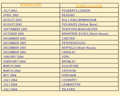 Virgin ware currently operates 18 own stores in the UK, with a further 5 under negotiation. The rollout programme is for 25-30 stores in the UK by the end of 2004.