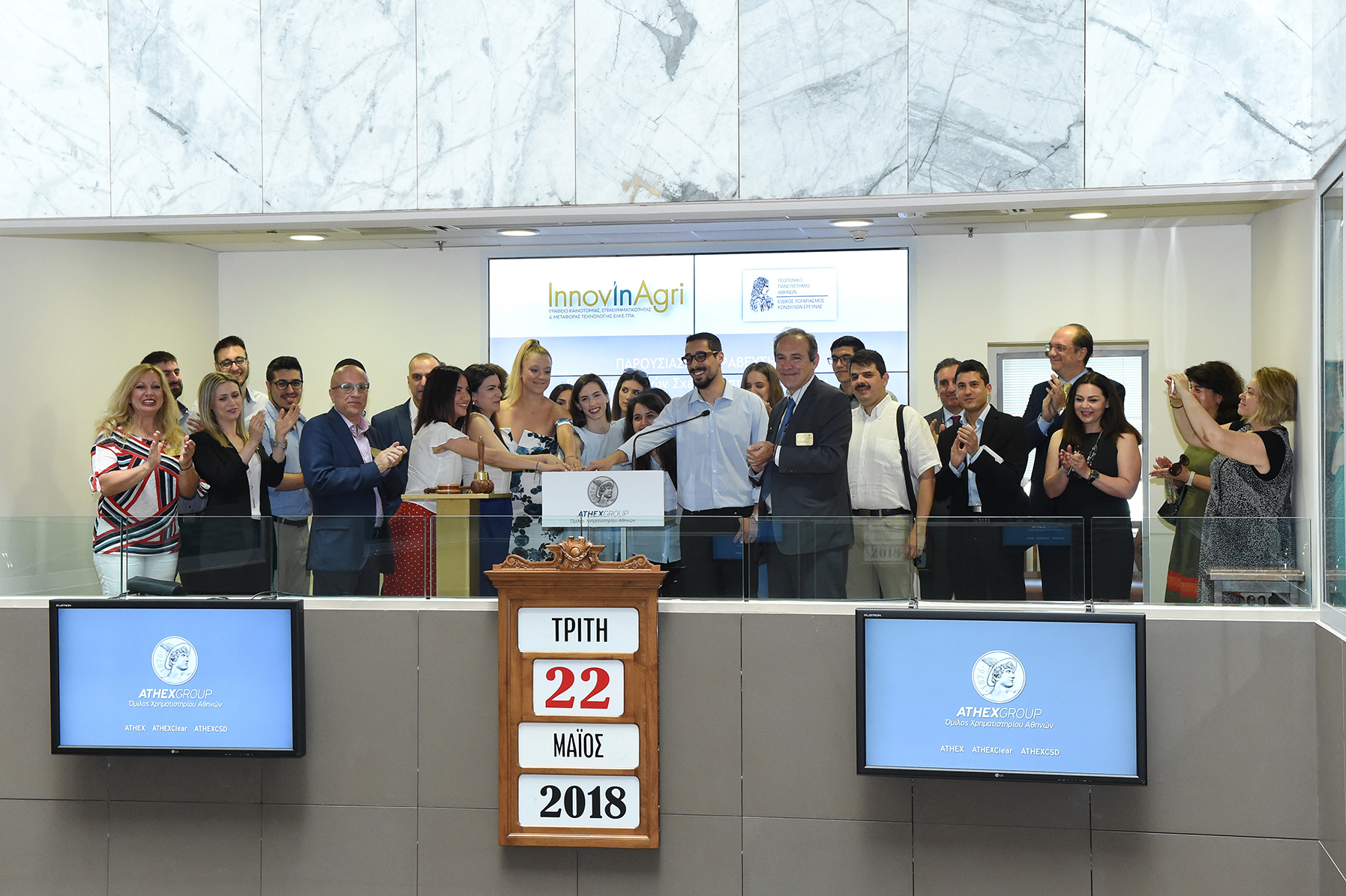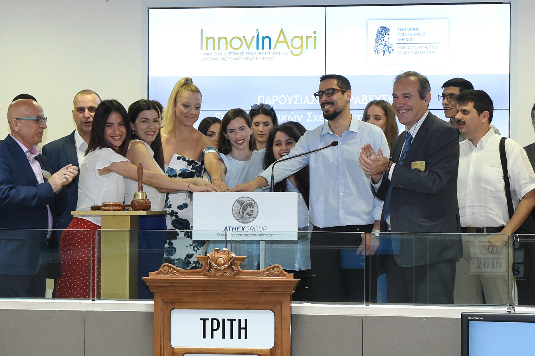 The traditional bell during the opening ceremony of the Athens Exchange today was rung by a group of students of the Agricultural University of Athens, headed by Deputy Rector, Mr. Stavros Zografakis.