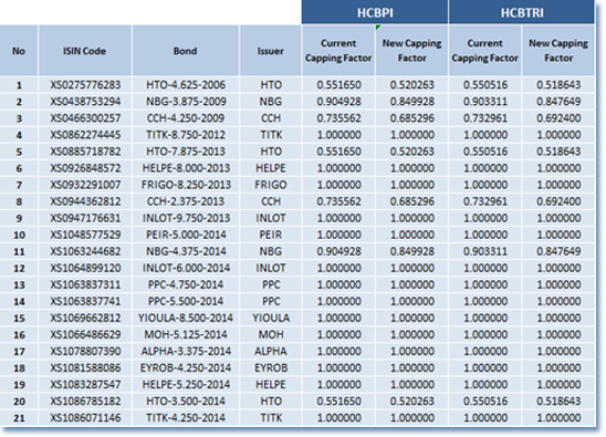 Athens Stock Exchange announces the changes in the composition of Hellenic Corporate Bond Indices and the new capping factors of the bonds participating in the composition of the indices according to Index Ground Rules.