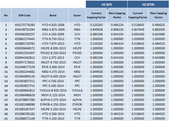 Athens Stock Exchange announces the changes in the composition of Hellenic Corporate Bond Indices and the new capping factors of the bonds participating in the composition of the indices according to Index Ground Rules.