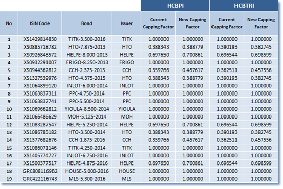 Athens Stock Exchange announces the changes in the composition of Hellenic Corporate Bond Indices and the new capping factors of the bonds participating in the composition of the indices according to Index Ground Rules.