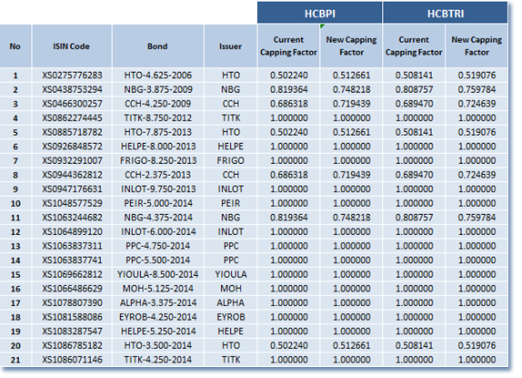Athens Stock Exchange announces the changes in the composition of Hellenic Corporate Bond Indices and the new capping factors of the bonds participating in the composition of the indices according to Index Ground Rules.