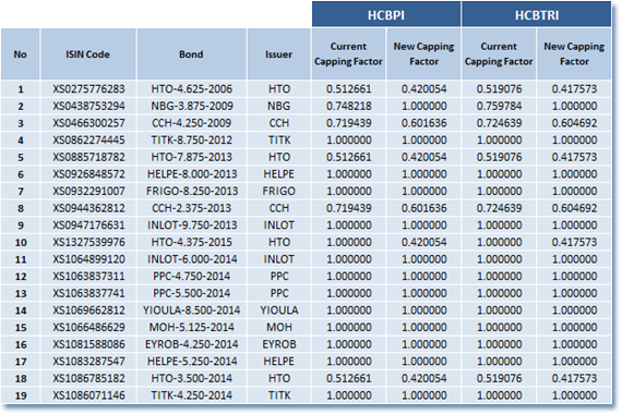Athens Stock Exchange announces the changes in the composition of Hellenic Corporate Bond Indices and the new capping factors of the bonds participating in the composition of the indices according to Index Ground Rules.