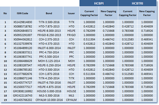 Athens Stock Exchange announces the changes in the composition of Hellenic Corporate Bond Indices and the new capping factors of the bonds participating in the composition of the indices according to Index Ground Rules.