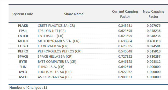 The Athens Stock Exchange and FTSE Russell, following the results of the semi-annual review of the FTSE/ATHEX Index Series for the period May 2021 - October 2021, announce the new Capping Factors for the shares in the composition of the following FTSE/ATHEX indices: