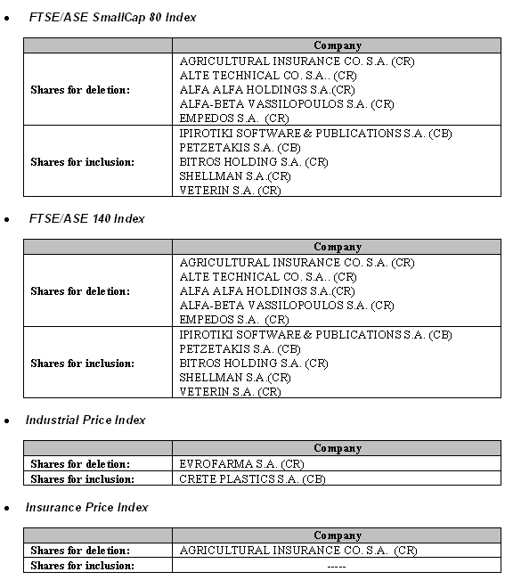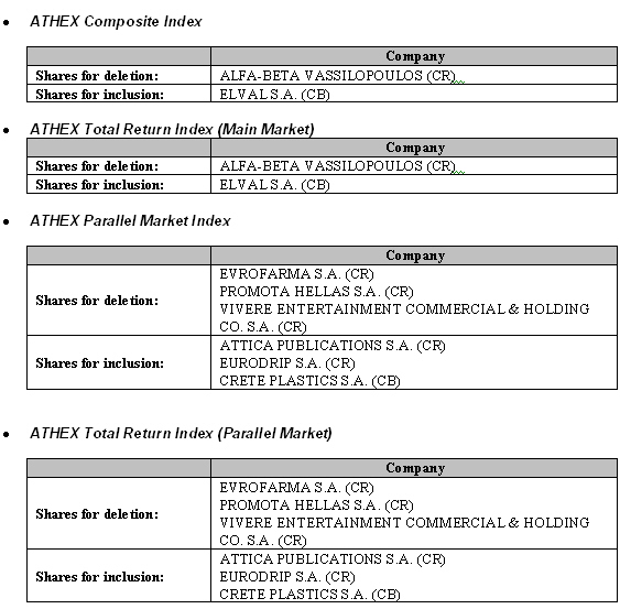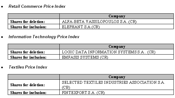 Due to changes in the composition of the time of the shares of ATHEX that will apply as of October 18, 2004, the shares that are transferred into the 3-hour trading model will be deleted from the list of the relevant indices in which they participate, in accordance with the ATHEX Regulation.