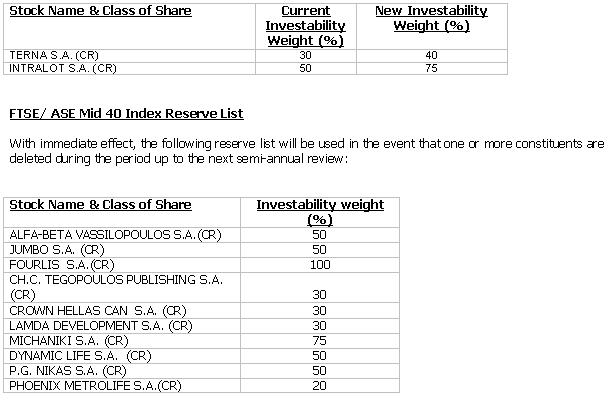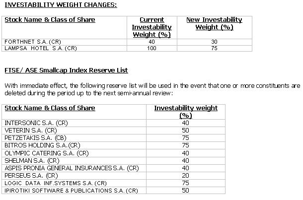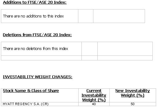 For the FTSE/ASE 20, there were no additions to or deletions from this index. One (1) Investability weight change to existing constituents was approved.