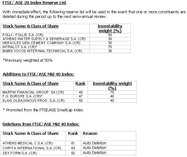 FTSE/ASE 20, FTSE/ASE MID 40 & FTSE/ASE SMALLCAP INDEX SEMI-ANNUAL CHANGES