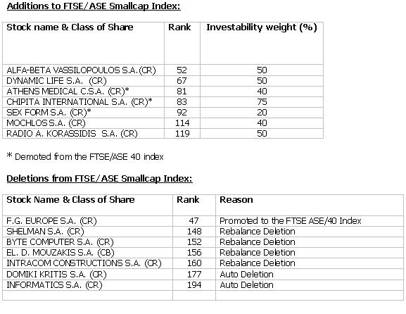Following the semi-annual meeting of the FTSE/ASE Index Advisory Committee on Wednesday, 21 April 2004, the following changes were announced:
